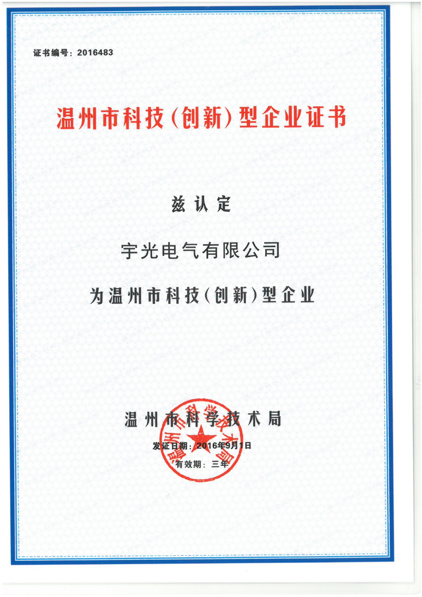 温州市科技(创新)型企业证书